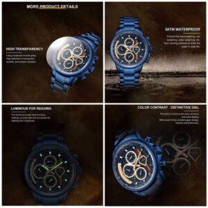 - Visokokvalitetni materijal: Japanski pokret obezbeđuje tačno merenje vremena, futrolu sa vakuumom jonom za zaštitu životne sredine, kaljeno mineralno staklo, kaiš od nerđajućeg čelika, odgovarajuću težinu sata i udoban za nošenje