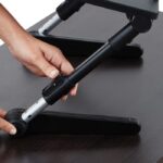 - Dolazi u pakovanju sklopljen u oblik većeg laptopa. Izvadite iz kutije, okrenite ga da rukohvat bude u gornjem delu i ne bude do Vas. Pritisnite, kako bi se sklopljene nogare otvorile u prav ugao. Zatim, postavite tako da postolje bude na podlozi. Na gornjem delu nogare je dugme koje pritisnete, kako bi se otvorile. Tako nogare postavljete u položaj koji želite. Okrenite naopaku, kako bi nogare bile na podlozi i spremni ste za rad.