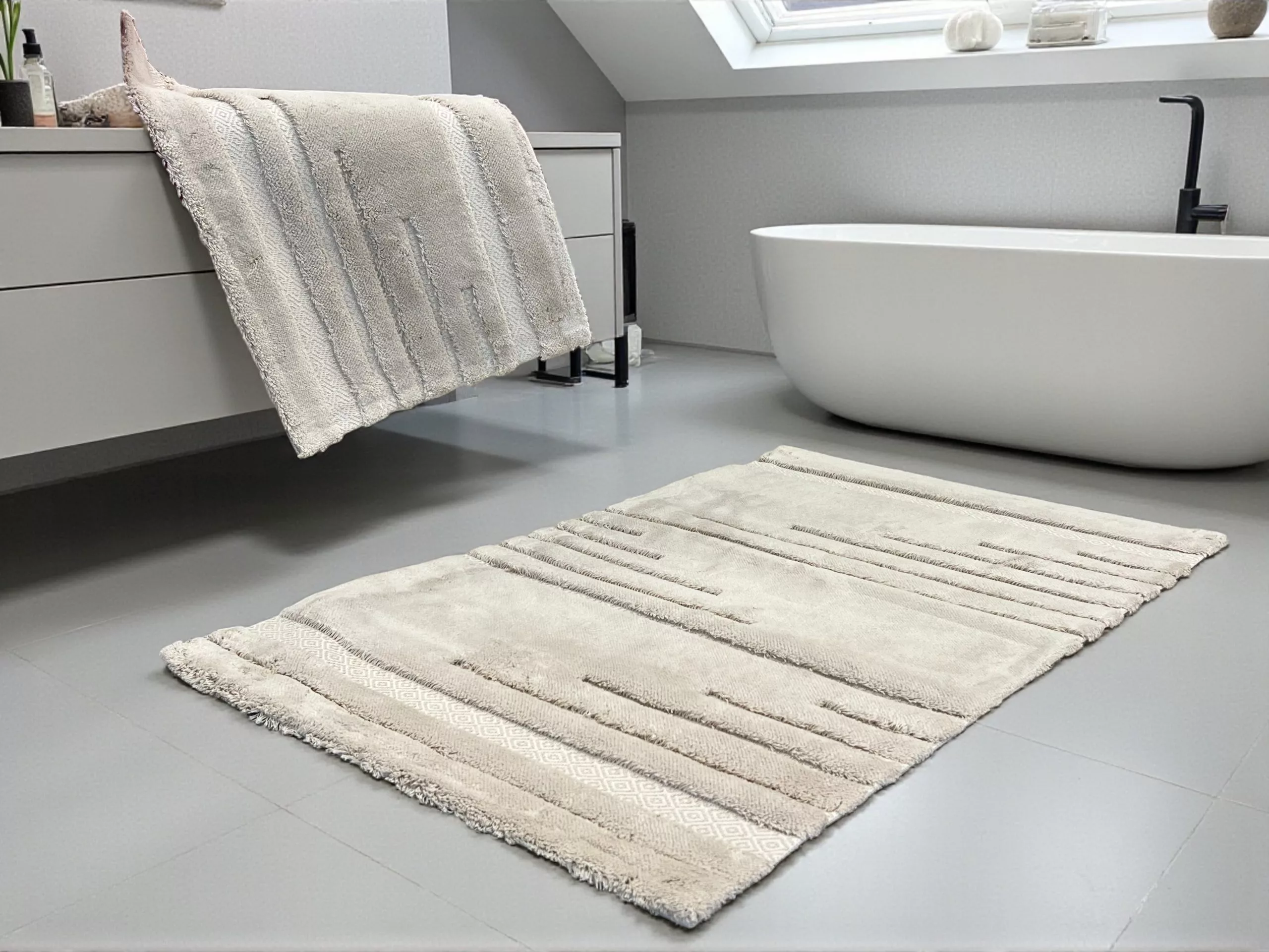 Dvoslojni set prostirki za kupatilo, izrađen od 100% pamuka sa protivkliznom podlogom. Mekana, upijajuća i izdržljiva tekstura pruža maksimalnu udobnost i sigurnost pri svakom koraku. Savršeno se uklapa u svaki stil kupatila.