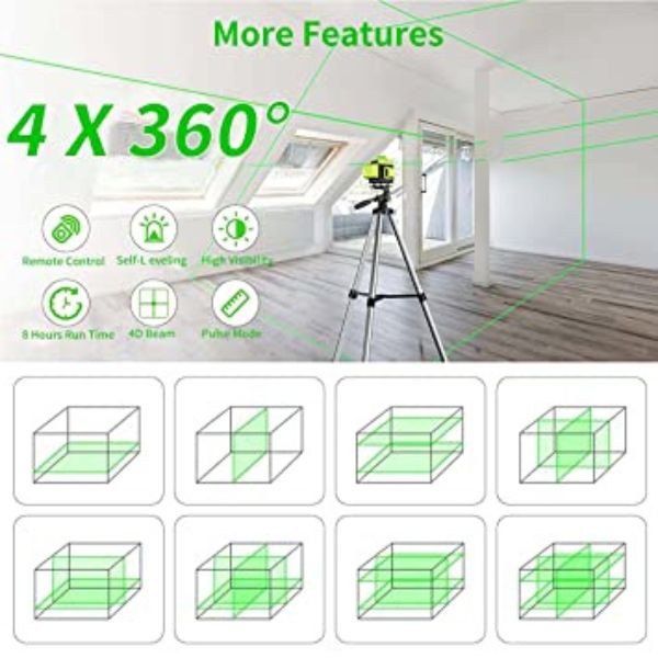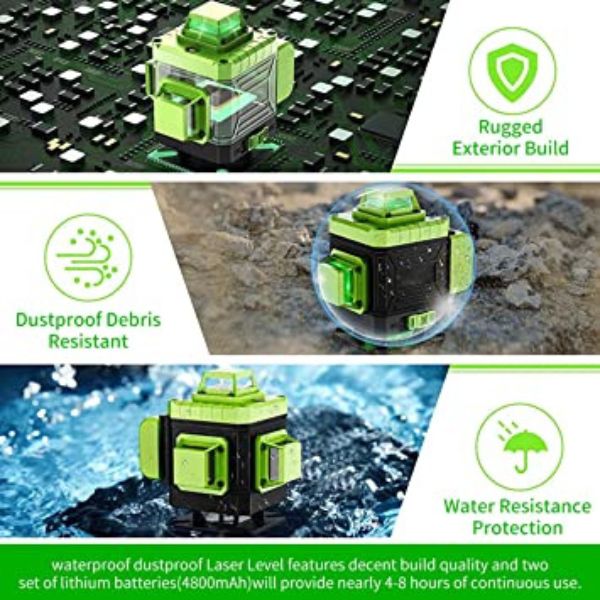 - Nivelator ima tri laserska prozora, svaki prozor pokreće 4 laserske linije i može u potpunosti pokriti sav prostor