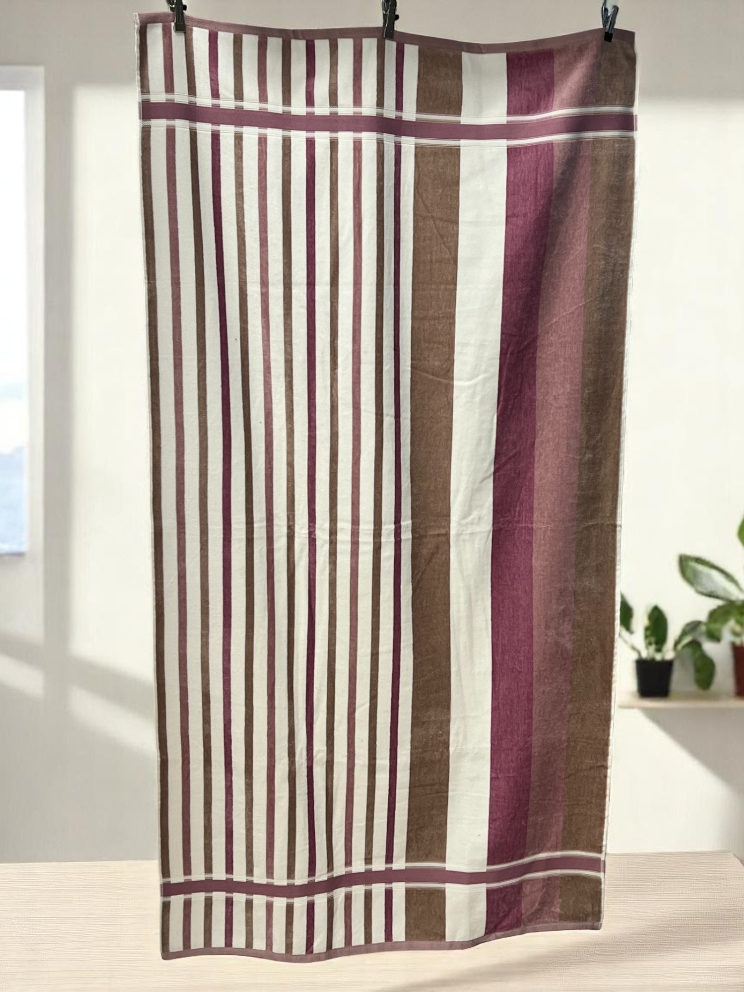 Unesite eleganciju u vaše letnje dane uz ovaj sofisticirani plažni peškir sa klasičnim prugastim dezenom u toplim zemljanim tonovima. Dimenzije 88×166 cm pružaju dovoljno prostora za udobno sunčanje, ležanje na plaži ili upotrebu pored bazena.