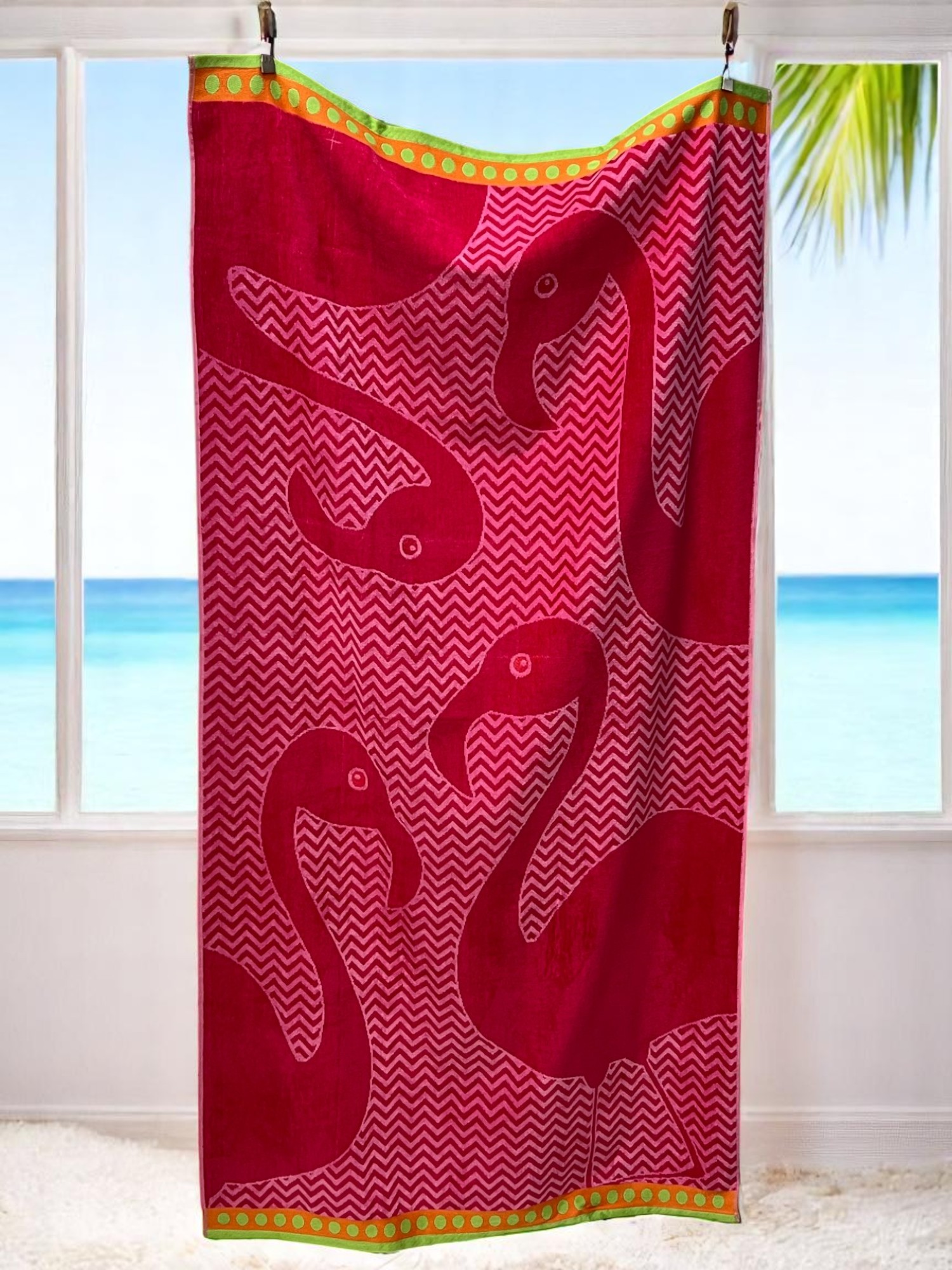 Unesite tropski šarm na plažu uz peškir Flamingo Tropic dimenzija 164×85 cm. Ovaj upečatljiv peškir u živim nijansama roze i crvene krasi prepoznatljiv motiv flamingosa na cik-cak pozadini, savršen za letnje dane uz more ili bazen. Rubovi su ukrašeni šarenom bordurom sa kružićima u kontrastnim bojama, dajući mu razigran izgled.