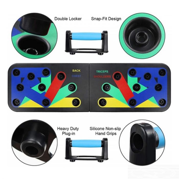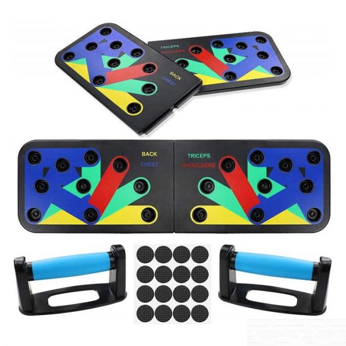 Kompletna preklopna daska za izvodjenje sklekova u skladu sa mišićem kojim želite da radite.Ima sistem boja koje ukazuju na to kako vežbu treba izvoditi prema delu tela koji se tonira.Ovaj set je vrlo jednostavan za upotrebu,a možete ga poneti i bilo gde,a pošto je sklopiv zauzima samo mali prostor,ostavljajući mogućnost čuvanja u ormaru.
