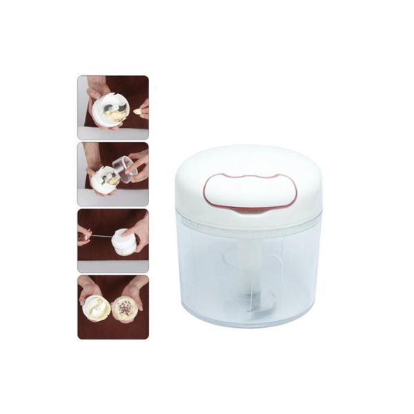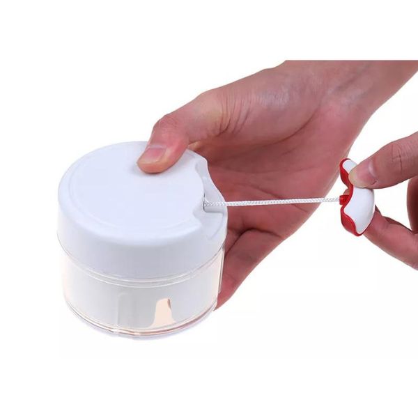 - On sa strane ima ručku koja, kada je povučete, pokreće žicu koja okreće noževe unutar secka. U zavisnosti od toga šta ste u njega ubacili, potrebno je svega par povlačenja da bi se sadržaj isitnio. Kada završite, otvorite ga i sipate isitnjeni sadržaj u posudu/obrok.