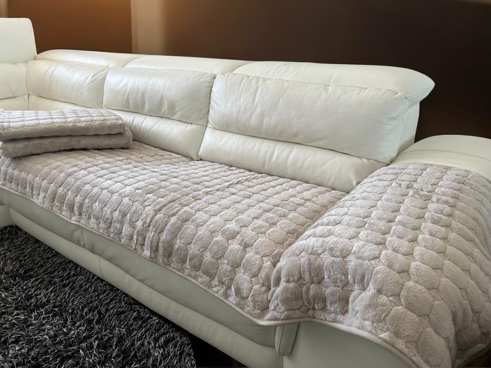 Prekrivač set MEGA (trosed-dvosed-fotelja) sačinjen je od čistih mikrofiber vlakana koje sa jedne strane predstavljaju adekvatnu zamenu mekanog pliša,a sa druge protivklizni materijal koji je otporan na habanje.