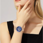Jedinstveni plavi brojčanik sa detaljima u ružičastoj zlatnoj boji pruža vizuelni kontrast i privlačnost. Sat takođe ima hronograf funkciju, koja omogućava precizno merenje vremena. Otporan je na vodu do 30 metara, što znači da ga možete nositi i tokom plivanja ili pranja ruku.